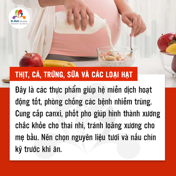 Đây là các thực phẩm giúp hệ miễn dịch hoạt động tốt, cơ thể khỏe mạnh và phòng chống các bệnh nhiễm trùng. Các thực phẩm này cũng đồng thời cung cấp các khoáng chất như canxi, phospho giúp hình thành bộ xương chắc khỏe cho thai nhi, tránh loãng xương cho mẹ. Nên chọn nguyên liệu tươi và nấu chín kỹ trước khi ăn.