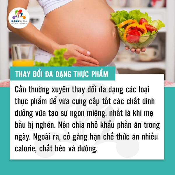 – Cần thường xuyên thay đổi đa dạng các loại thực phẩm để vừa cung cấp tốt các chất dinh dưỡng vừa tạo sự ngon miệng, nhất là khi bà mẹ bị nghén.