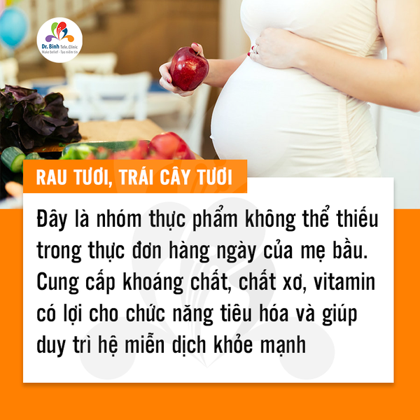 – Rau tươi, trái cây tươi các loại là nhóm thực phẩm không thể thiếu trong thực đơn hàng ngày của bà mẹ mang thai.