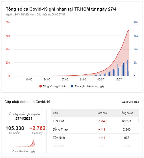 Zing đưa tin, theo Trung tâm Kiểm soát Bệnh tật TP.HCM (HCDC) sáng 27/7, thành phố có tổng cộng 67.289 trường hợp mắc Covid-19 được Bộ Y tế công bố (chưa tính số ca nhiễm đã công bố sáng ngày 27/7 là 1.849 người). Trong đó, 66.985 trường hợp nhiễm trong cộng đồng và 304 người nhập cảnh.
