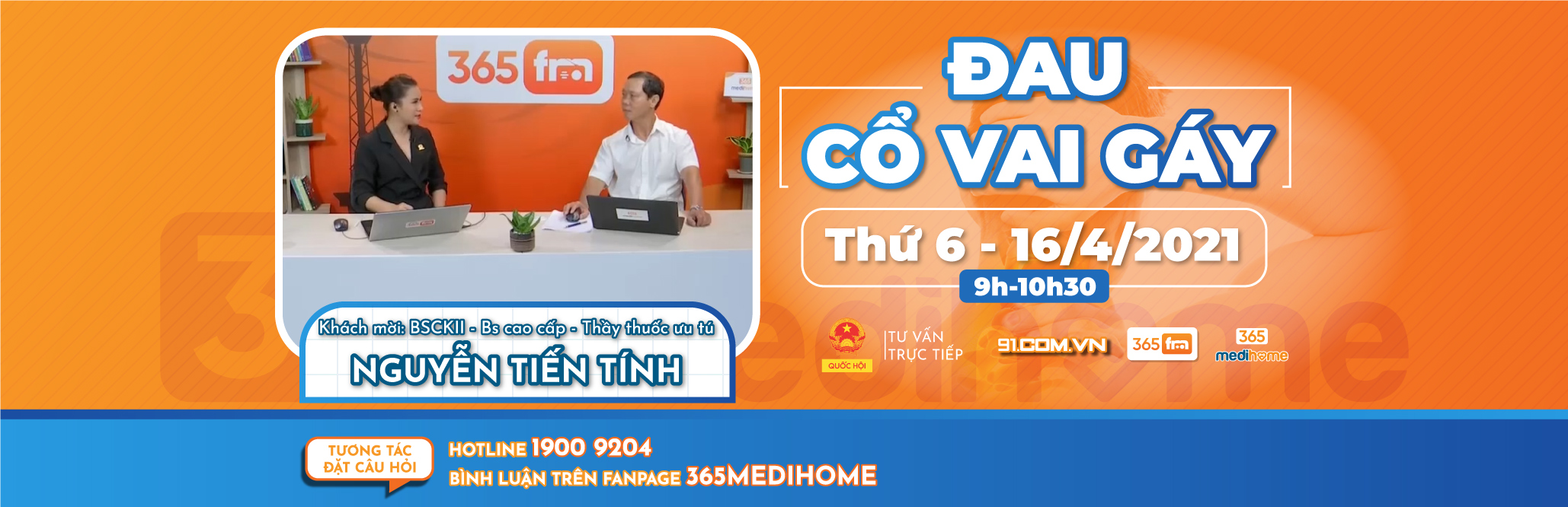Bệnh đau cổ vai gáy không phải là bệnh hiếm gặp và xuất hiện ở nhiều lứa tuổi khác nhau. Bệnh này tuy không gây nguy hiểm đến tính mạng nhưng gây khó khăn trong sinh hoạt hàng ngày. Trong chương trình truyền hình trực tiếp tư vấn sức khỏe của BSCKII. BSCC. Thầy thuốc ưu tú NGUYỄN TIẾN TÍNH – Thành viên của Trung tâm nghiên cứu phát triển công nghệ y tế từ xa Việt Nam sẽ giải đáp cho tất cả quý khán thính giả xoay quanh chủ đề “ĐAU CỔ VAI GÁY”. Chương trình được thực hiện bởi Phòng khám đa khoa online 365 Medihome phối hợp với Đài truyền hình Quốc hội Việt Nam, phát sóng vào hồi 09h – 10h30 thứ sáu ngày 16/04/2021.