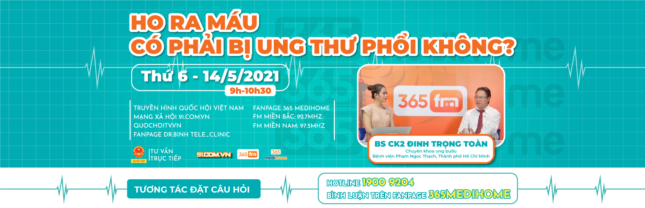 Bệnh ho ra máu là một dấu hiệu liên quan đến các bệnh về đường hô hấp, trong đó có các bệnh tại phổi, vậy “HO RA MÁU CÓ PHẢI LÀ UNG THƯ KHỔI KHÔNG?” mời quý khán thính giả cùng đón xem chương trình tư vấn trực tiếp sức khỏe của BS CKII ĐINH TRỌNG TOÀN – Chuyên khoa Ung bướu BV Phạm Ngọc Thạch Tp HCM, chương trình trên sóng truyền hình Quốc hội Việt Nam (Quochoitv.vn) vào hồi 09h – 10h30 thứ 6 ngày 14/05/2021.