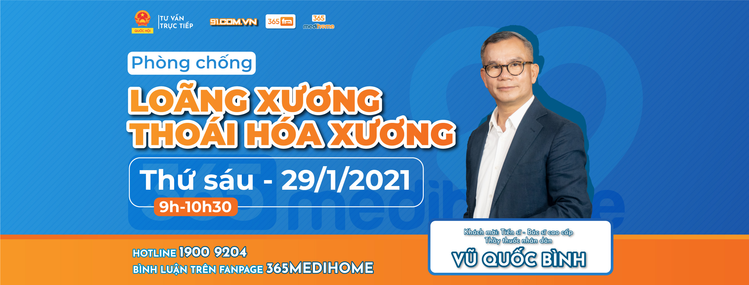 Trong chương trình truyền hình trực tiếp tư vấn sức khỏe của BS VŨ QUỐC BÌNH sẽ chia sẻ tất cả những kiến thức bổ ích về cách phòng chống loãng xương, ở chương trình bác sĩ sẽ giải đáp những thắc mắc các vấn đề về xương, khớp. Giúp cho người bệnh yên tâm, sống vui khỏe và có ích mỗi ngày. Tải app 365 medihome để được các chuyên gia sức khỏe hàng đầu tại Việt Nam tư vấn và khám bệnh miễn phí qua video call.