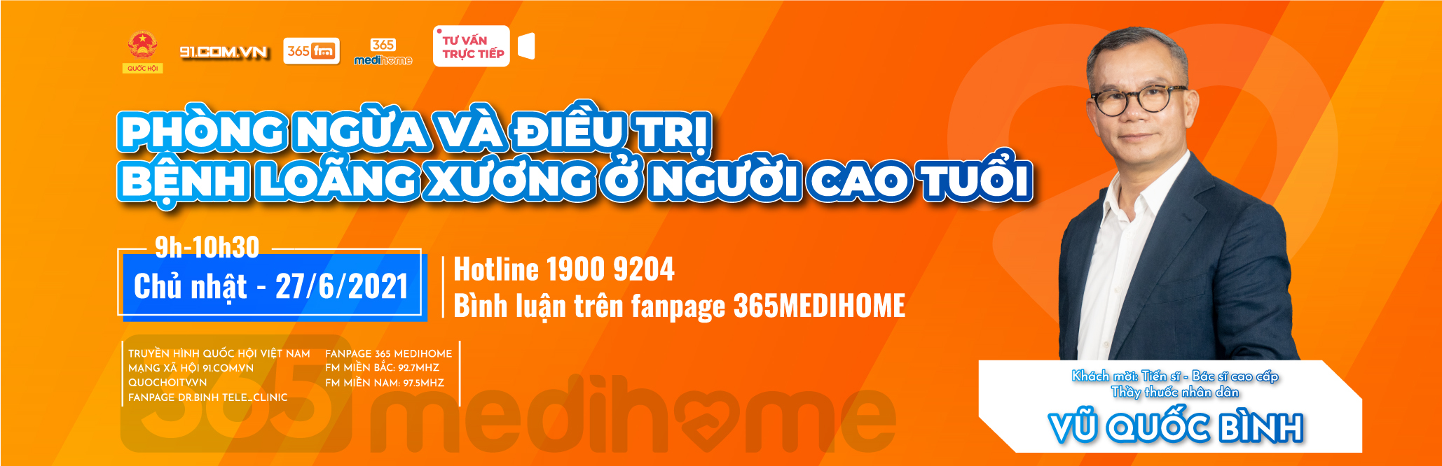Loãng xương là bệnh khá phổ biến hiện nay ở người cao tuổi, để hiểu rõ hơn về tầm quan trọng của việc Phòng ngừa và điều trị bệnh loãng xương ở người cao tuổi, mời quý khán giả cùng đón xem chương trình tư vấn sức khỏe trực tiếp trên sóng truyền hình (quochoitv.vn), khách mời của chương trình là TS. BSCC. Thầy thuốc nhân dân VŨ QUỐC BÌNH – Giám đốc Trung tâm nghiên cứu phát triển công nghệ y tế từ xa Việt Nam. Chương trình được phát sóng vào hồi 09h -10h30 chủ nhật ngày 27/06/2021, được thực hiện bởi Phòng khám đa khoa online 365Medihome kết hợp cùng Đài truyền hình quốc hội Việt Nam.