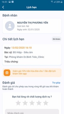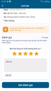Đánh giá: Sau khi khám xong, bệnh nhận có thể đánh giá về chất lượng dịch vụ qua sao và nhập hoặc chọn bình luận. Sau đó, nhấn “Gửi đánh giá”